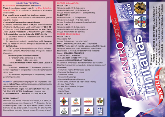 La Hermandad de Jesús Cautivo del Polígono de San Pablo organizará el X Encuentro Nacional de Hermandades y Cofradias Trinitarias, Según la información recibida hace poco más de una hora ha finalizado en la localidad de Antequera (Málaga) el IX Encuentro Nacional de Hermandades Trinitarias, donde se ha elegido por unanimidad la única candidatura presentada, la de nuestra Hermandad, siendo designada para organizar el X Encuentro Nacional de Hermandades y Cofradías Trinitarias que se celebrará en el 2010.