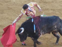 Manuel Jesús “El Cid” se quitó las zapatillas y se ajustó los machos para torear en la playa de la Real Maestranza. El fuerte e intenso aguacero había inundado gran parte del piso de la plaza y el ruedo se convirtió pronto en un peligroso lodazal. Este encuentro de El Cid con “Onirico” nos recordaba los tradicionales festejos taurinos que se celebran en algunos pueblos costeros, como Candás, donde se aprovecha la bajada de la marea para celebrar las corridas de la Feria de esta población marinera de Asturias. ¡Lo malo es cuando sube la marea…!